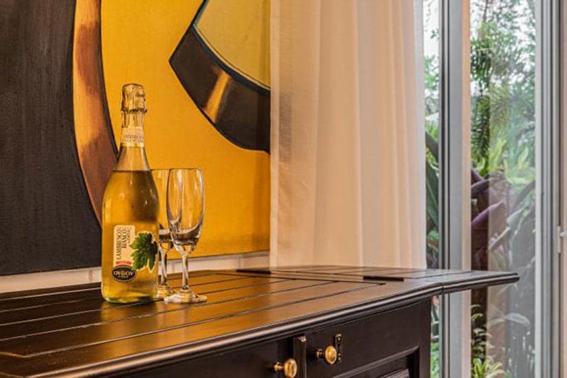 The Goa villa has a beautiful, spacious bright and warm living room that instantly lifts your spirits. The living room is furnished with modern artefacts, refreshing indoor plants, comfy furniture’s and more bringing luxury at your fingertips. The kitchen is fully equipped with cutlery, cookware, serveware and more. You can self cook or hire a chef to do the same. The dining space too occupies the ground floor were upto 6 pax can dine together. The floor to ceiling glasses allow maximum sunlight into the rooms keeping them airy and bright.
