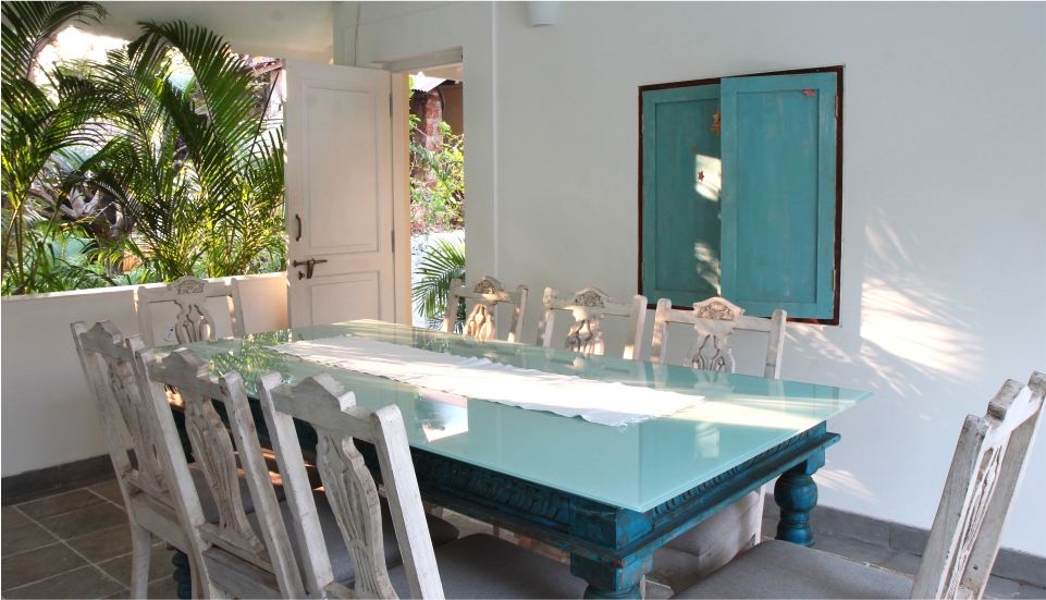 The living room in this Goa villa is spacious and luxurious with classy furniture and lovely artifacts. This Portuguese style villa has large French doors that allow maximum sunlight into the room. There is a TV sit-out were you can gather around for a movie or your favorite show. The dining room is placed overlooking the swimming pool acting perfect for a group of about 8 to dine together.